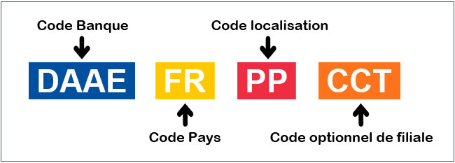 Quatre lettres identifient le code de la banque, les deux suivantes le code du pays. Les deux caractères suivants (lettre ou chiffres) indiquent la localisation. Il peut être complété par trois caractères correspondant à une agence.