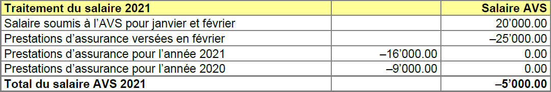 Le décompte d’une prestation d’assurance pour l’exercice précédent et l’année de décompte, en lien avec une sortie, génère dans l’exemple ci-après un salaire AVS négatif.