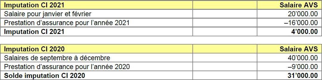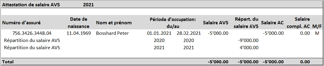 En raison de ce cas de figure, un salaire AVS négatif est transmis à la caisse de compensation à la fin de l’année. Une imputation négative sur le compte individuel (CI) de la personne concernée n’est pas possible et une répartition correcte des prestations d’assurance sur les années correspondantes ne peut être effectuée qu’après consultation de l’entreprise.
