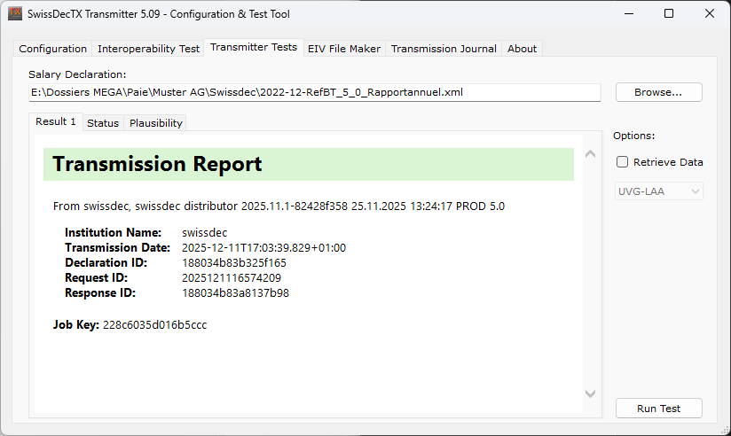 Cette page se passe d’explications : il suffit d’indiquer le nom du fichier contenant la déclaration à transmettre et de cliquer le bouton Run Test. Le résultat devrait s’afficher comme ci-dessus tandis que le status et le résultat de plausibilité s’affiche dans son propre onglet.